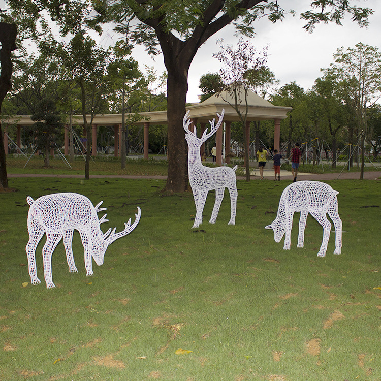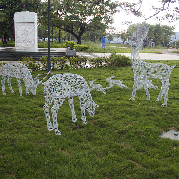 使用钢丝网制作的镂空鹿雕塑,把线条和空间的艺术和雕塑结合起来,形成了全新的雕塑方式。制作这种雕塑,需要极大的耐心和细心,要保证线条的流畅性和每根钢丝之间的平行,一旦出现钢丝线条距离不均匀的情况,完成的雕塑成品会非常难看。此外,对于焊点的处理也有要求,尽量做到平滑无突出。