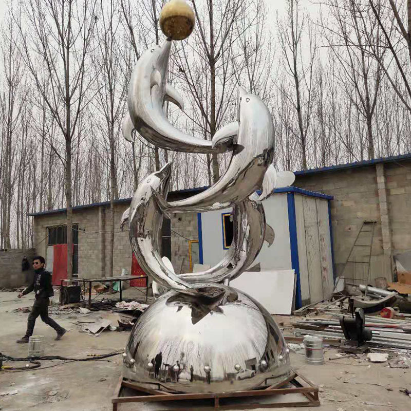 镜面不锈钢海豚雕塑,几只海豚组合在一起,和谐美好,看上去赏心悦目,美轮美奂。
