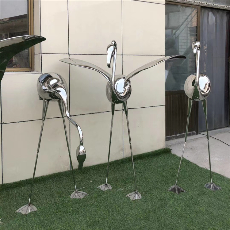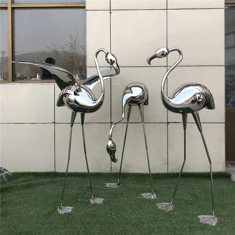 不锈钢火烈鸟雕塑象征象征着自由洒脱,脱离凡尘。火烈鸟的特征脖子长,常呈S型弯曲;嘴短而厚,上嘴中部突向下曲,下嘴较大成槽状,上喙比下喙小;脚极长而裸出,向前的3趾间有蹼,后趾短小不着地;翅大小适中;尾短。镜面不锈钢火烈鸟雕塑制作工艺流程:图纸设计→3D打印泡沫→翻制玻璃钢模具→不锈钢板材锻造→焊接修复成形→打磨抛光镜面。