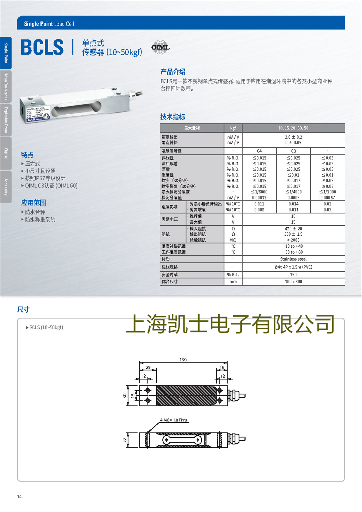 产品介绍:BCLS是一款不锈钢单点式传感器,适用于应用在潮湿环境中的各类小型商业秤台秤和计数秤。