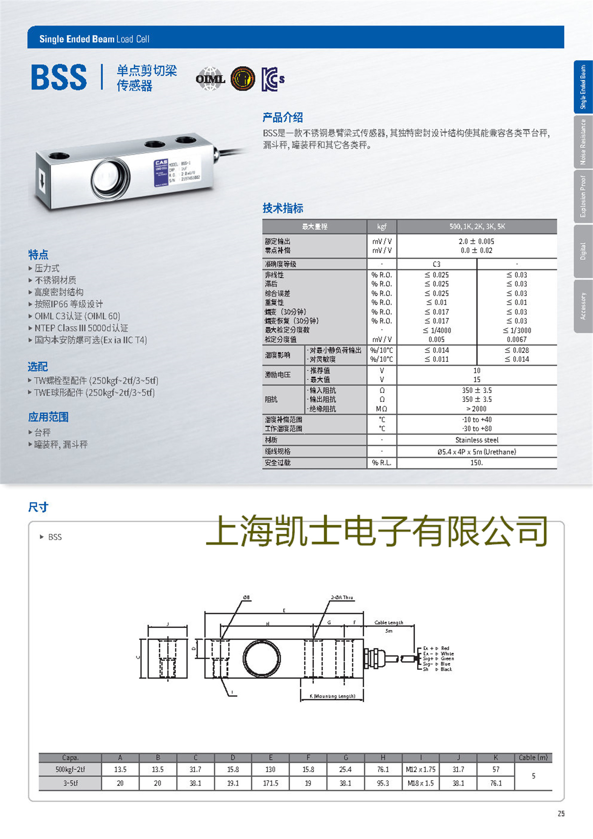 二、韩国凯士CAS BSS款不锈钢悬臂梁式称重传感器 全部型号