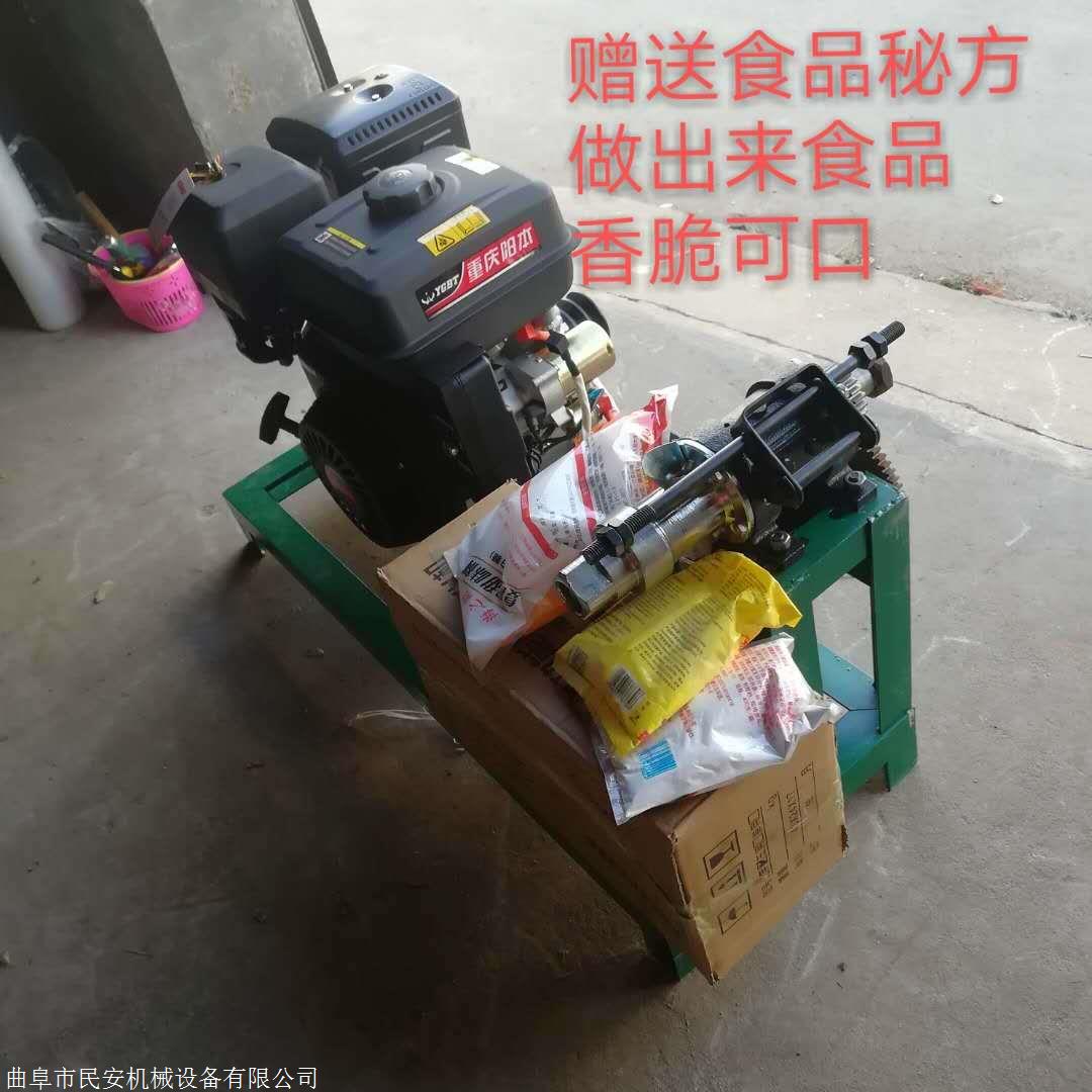 以大米、玉米、高粱米、黄米等为原料,并可添加各种调料,利用自身发热能将原物膨化成90倍以上好滋味膨化果。启用动力后加入原料就可生产出空心棒形、花生形、饼干形形、小米花形、 麻花形、梅花形、等7种各种形状各异的膨化果,果实香酥甜脆,老小皆宜。如另外配上模具可加工五角星形、四方形、绿豆形、菱形、锅巴形、火柴盒形等膨化果,膨化出的产品形状多样化,并具有自断成形装置,时产量25-50公斤,同时膨化出的玉米花型可制作。民安机械随机配有模具头和机器使用操作说明书。该机以体积小、重量轻、结构精巧、操作技术简单和可观的经济效益,赢得了广大用户的青睐。