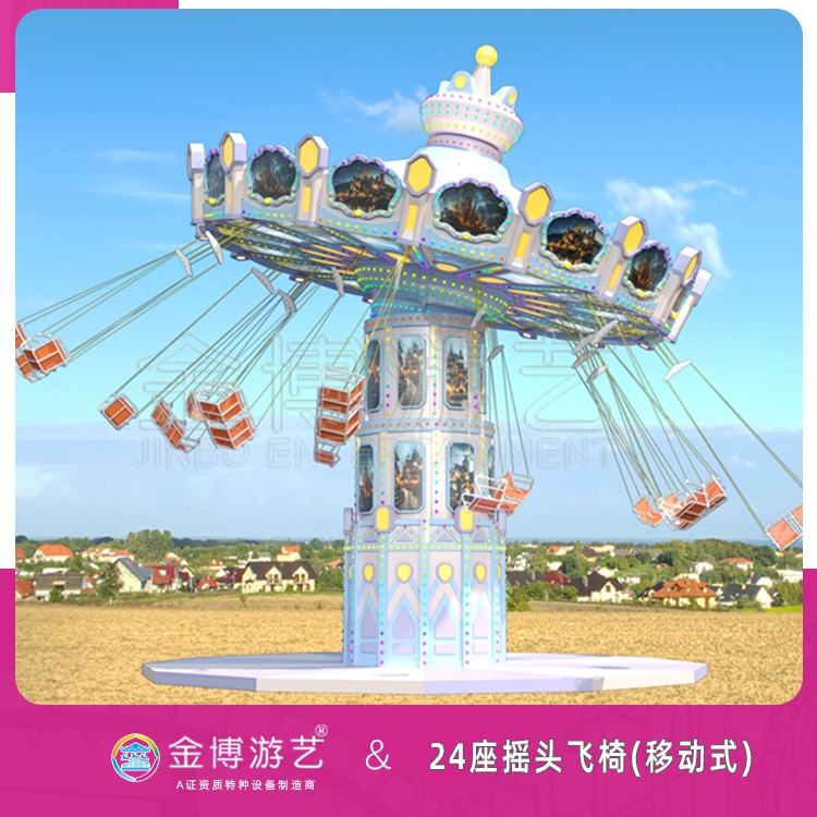 24人无基础摇头飞椅(8个单人座椅,8双人座椅)是一款经过改造的飞椅系列的产品。“豪华飞椅”是陀螺飞行塔类游乐设备的一种大型游乐设备,由上旋转大盘倾斜旋转运行,游客乘坐在垂挂的吊椅上,随转盘的转动徐徐升起,仿佛翱翔于天际,又如置身于波荡起伏的大海中,惊险刺激,其乐无穷!