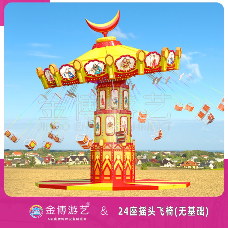 24人无基础摇头飞椅(8个单人座椅,8双人座椅)是一款经过改造的飞椅系列的产品。“豪华飞椅”是陀螺飞行塔类游乐设备的一种大型游乐设备,由上旋转大盘倾斜旋转运行,游客乘坐在垂挂的吊椅上,随转盘的转动徐徐升起,仿佛翱翔于天际,又如置身于波荡起伏的大海中,惊险刺激,其乐无穷!
