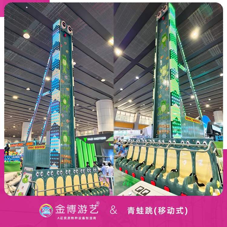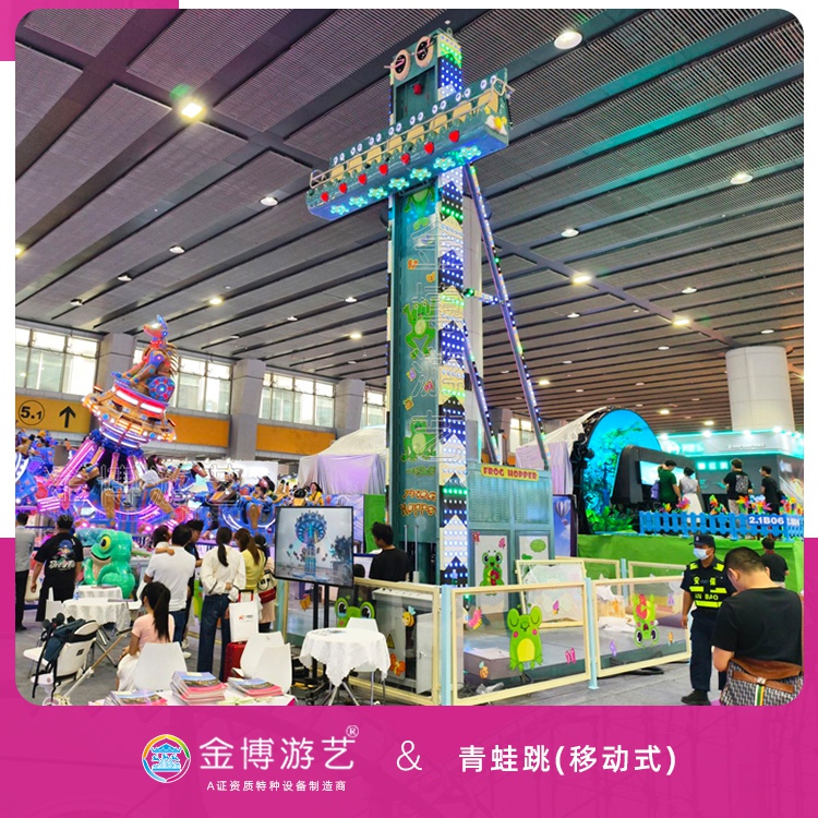 青蛙跳以青蛙为主题设计,色彩鲜艳,造型可爱,是一种深受游客喜爱的飞行塔类游乐设施。金博游艺青蛙跳为B级省检,无基础移动式,气动装置。
