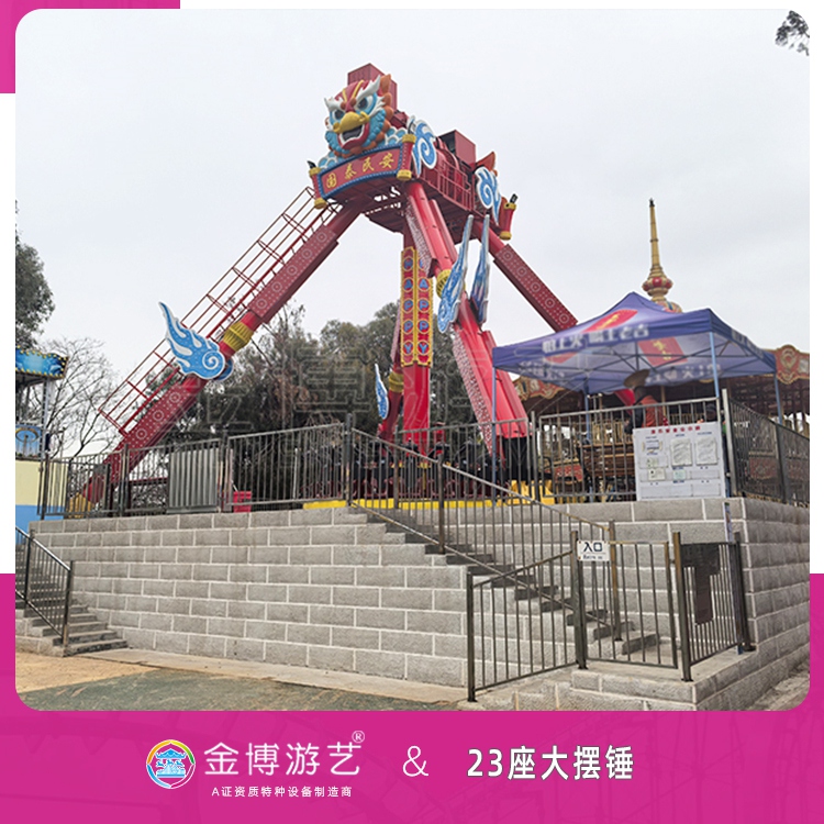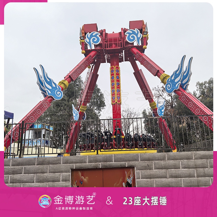 23座大摆锤,一款全新元素搭配的观览车游乐设施,支撑架以虎虎生威的舞狮遥望四周,摆臂增添了大鹏展翅的飞翼点缀,站台融入了锦上添花的复古造型。23座大摆锤整体色调以中国红为主,辅助的吉祥黄色使整体更为瞩目。其座椅向外,沿圆周分布,形似“摆锤”。游客乘坐其中,除绕摆臂旋转外,“摆锤”还绕回转座中心来回摆动。设备运行时游客在摆臂的跌荡起伏中,尽情体验超重与失重带来的快感,尽享在空中交替升降的刺激,是人们在紧张生活之余放松的一种方式,深受游客特别是青少年朋友喜爱的游乐设备之一。
