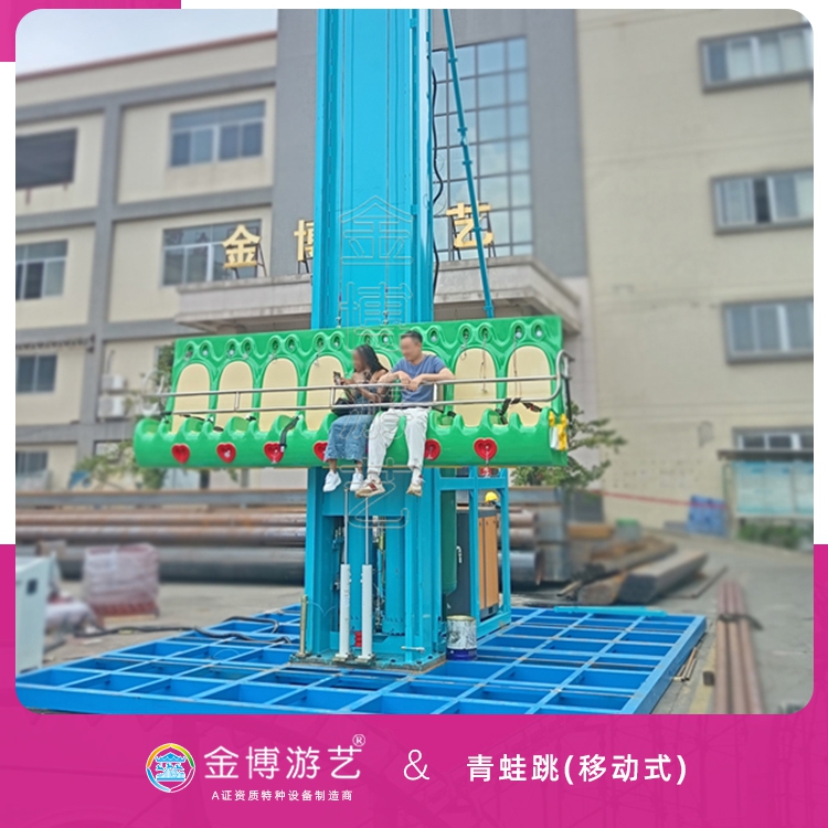 青蛙跳以青蛙为主题设计,色彩鲜艳,造型可爱,是一种深受游客喜爱的飞行塔类游乐设施。金博游艺青蛙跳为B级省检,无基础移动式,气动装置。