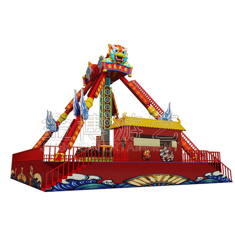 23座大摆锤,一款全新元素搭配的观览车游乐设施,支撑架以虎虎生威的舞狮遥望四周,摆臂增添了大鹏展翅的飞翼点缀,站台融入了锦上添花的复古造型。23座大摆锤整体色调以中国红为主,辅助的吉祥黄色使整体更为瞩目。其座椅向外,沿圆周分布,形似“摆锤”。游客乘坐其中,除绕摆臂旋转外,“摆锤”还绕回转座中心来回摆动。设备运行时游客在摆臂的跌荡起伏中,尽情体验超重与失重带来的快感,尽享在空中交替升降的刺激,是人们在紧张生活之余放松的一种方式,深受游客特别是青少年朋友喜爱的游乐设备之一。