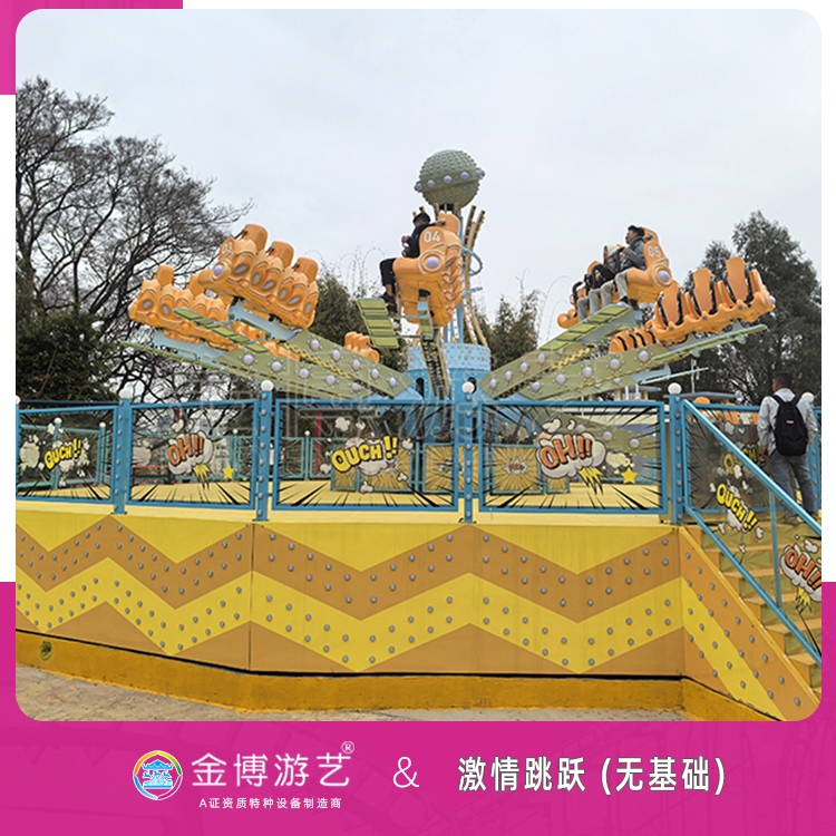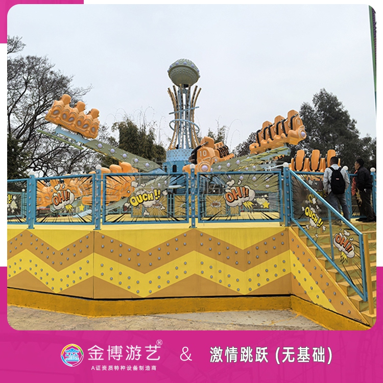 激情跳跃是自控飞机类产品,该产品外表装饰豪华,装饰灯2000多只,不同的色彩搭配,使整机华丽多彩,优美动人,配有DJ立体音响,十二个跳动座舱根据自动控制程序有多种跳跃模式,时而像蝴蝶一样翩翩起舞,时而像波浪一样此起彼伏,时而像江水漩涡一样顺势而下,时而像百合花瓣一样向上直挺,多种跳跃模式让你漱情四射,玩后的感觉会让你有一种忘我的快乐享受。本产品采用先进的气动及电气控制系统,整机符合GB8408《游乐设施安全规范》和GB/T 18163《自控飞机类游艺机通用技术条件》标准。产品使用材料,生产加工工艺先进,各种保护及装置安全可靠。适用于休闲旅游场地,游乐园,游乐场以及各种所,适应玩的人群广泛。