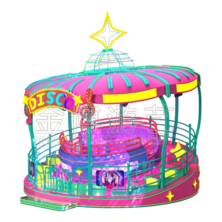 迪斯科转盘,圆盘运行时如大海波涛颠簸起伏,又如太空飞碟,变化无穷,时快时慢。迪斯科转盘转盘是陀螺类高速回转大型游乐设备。乘客紧紧吸俯在座舱,身体不再属于自己,把一切交给可以信任的宇宙游乐设备,你只要紧紧抓住以此成功的机会,就可以实现内心的自我。让耳旁呼呼的风声伴随你每一次完成的喜悦,胜利往往属于勇敢者。