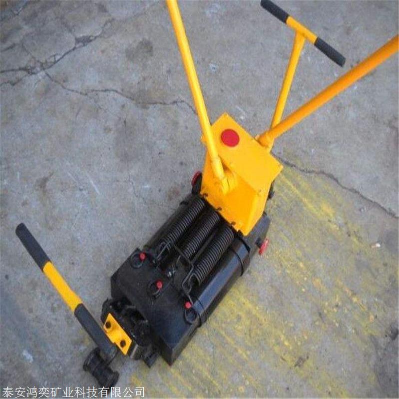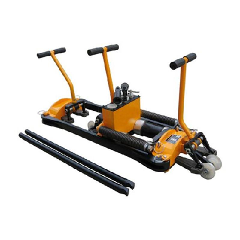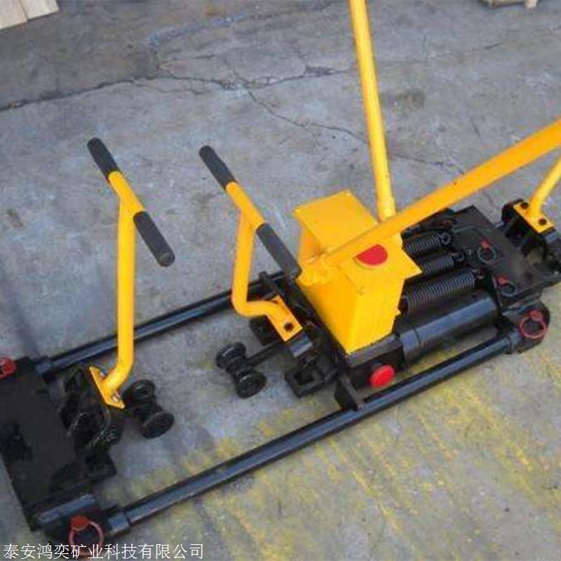 二、YFT-400液压轨缝调整器使用:手握拨杆横梁将YFT-400液压轨缝调整器置于单根铁轨顶面上,抬起拨杆,拨动楔铁外移,走行轮随同杠杆下降压在钢轨顶面上,轨缝调整器被撑起,这样就可使YFT-400液压轨缝调整器沿钢轨行走,运送到需要串轨处。