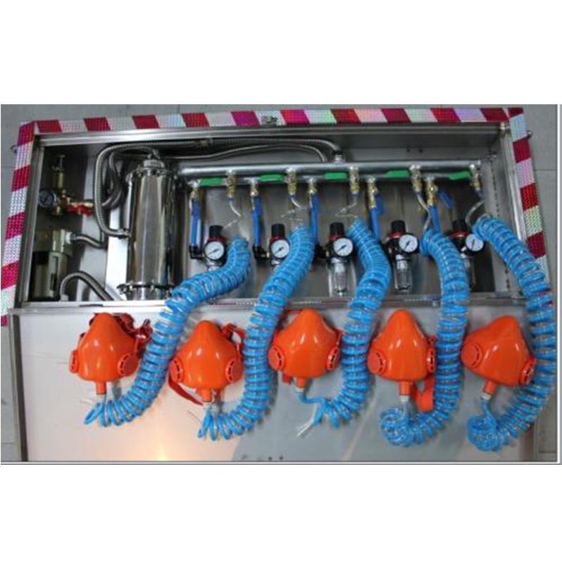 矿井压风自救供水系统在压风自救装置的基础上增加了,进水管、净水过滤器、水型压力表、排水装置(多组)等。同样箱体、安装板、总进气管、总进水管采用不锈钢制造而成。一箱六组供水,六组供气(可根据要求设计组别)。