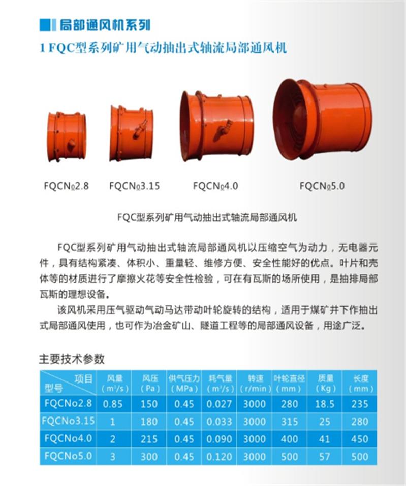 我厂生产销售的气动风机主要有FQC气动风机和FQ气动压入式轴流通风机等系列,FQC№2.8气动风机,FQC№3.15气动风机,FQC№4.0气动风机,FQC№5.0气动风机,FQ№3.55气动风机,FQ№5.6气动风机等等多种型号,总有一款适合您,今天没有FQC气动风机的质量,明天就没有销量,塑高尚人格,创好的煤矿用气动风机防爆局部通风产品。山东鸿奕期待您的垂询与合作!