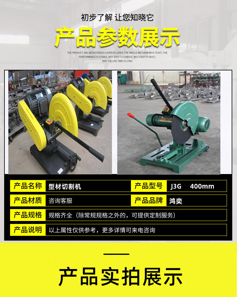 J3G3-400型材切割机更优于普通切割机,可采用多角度切割,拆除底板、更换适用的切割片、J3G3-400型材切割机可在各种板材上进行行走切割。