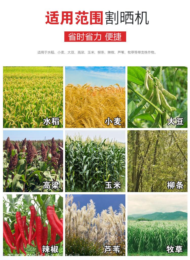 我厂生产的割晒机可以和微耕机,手扶拖拉机,四轮拖拉机配套使用,主要收割稻麦类茎秆类作物,条状铺放,配套动力:3.68-18kW工作幅宽:0.9-1.6m,立式割台,小扶禾器,作业效率:3-亩/小时,总损失率0.5,燃油消耗率0.272kg/小时,收割麦稻类、茎秆类及与麦稻类相似的作物(辣椒;大豆、胡麻、莜麦、荞麦、青玉米等),平原、山区、丘陵高原及套种都适应。该机主要是用来收割水稻、苜蓿、荞麦、油菜、小麦,牧草,药材等株高在0.4-1.2米的农作物,割幅为90/1米。传动装置采用链条、链轮。收割时与3WG-7田园管理机前旋挂式连接,具有结构紧凑、轻便灵活、使用可靠、操作简单、作业性能强,维护保养方便等优点。可以根据收割作物高低定做