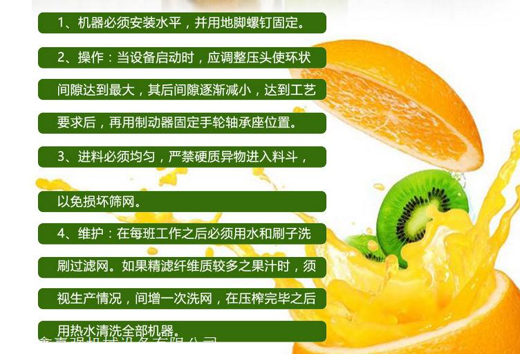 螺旋主轴的转动方向从进料斗向渣槽方向看去,为顺针时方向。原料加入进料斗中,在螺旋的推进下受压,其压榨的汁液通过过滤网流入底部的盛汁器,而废料则通过螺旋及调压头的锥形部分之间形成的空隙排出,调压头沿轴向的移动可调整空隙的大小。用手顺时针(从设备的出渣槽向进料斗看)转运手轮轴承座时,调压头向左,空隙即缩小,反之则空隙变大。改变空隙的大小,即调整出渣的阻力,即可改变出汁率,但如果空隙过小,在强力挤压下,部分渣的颗粒会和汁一起通过过滤网被挤出,尽管出汁增加,但汁的质量相对下降,空隙的大小应视用户具体工艺要求而定。