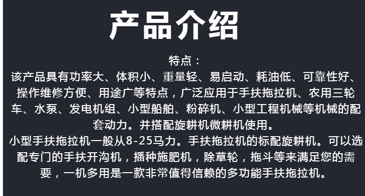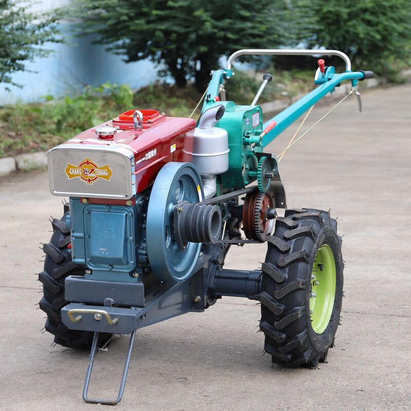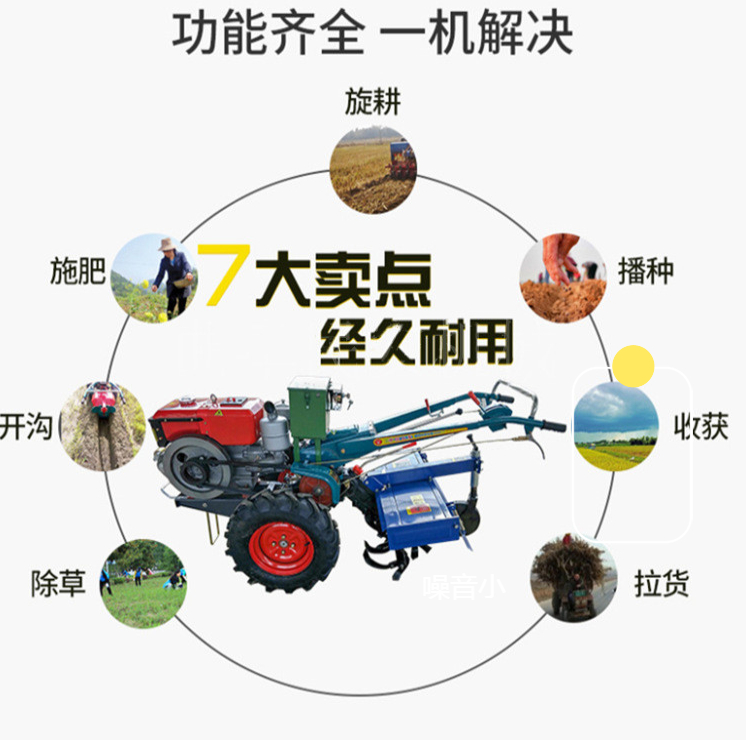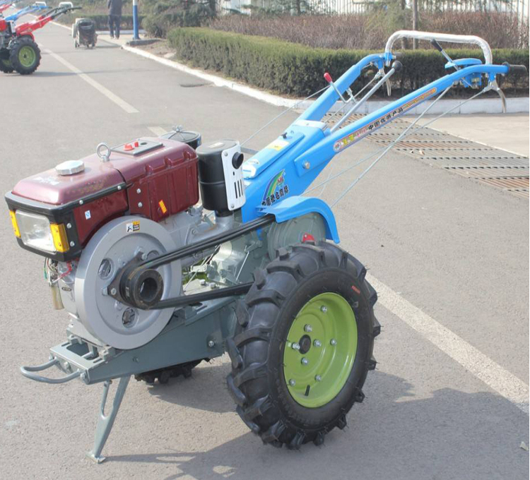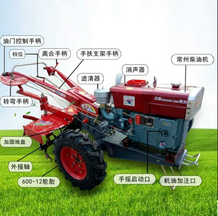 手扶拖拉机是由发动机,底盘、电气等系统组成的主要用于牵引和运输的多用途行走机械。手扶拖拉机能行驶是靠内燃机的动力经传动系统,获得驱动扭矩的驱动轮再通过轮胎花纹和轮胎表面给地面小、向后的水平作用力(切线力),这个反作用力就是推动拖拉机向前行驶的驱动力(也称喂推进力)。结构简单,功率较小,适于小块耕地。由驾驶员扶着扶手架控制操纵机构、牵引或驱动配套农具进行作业