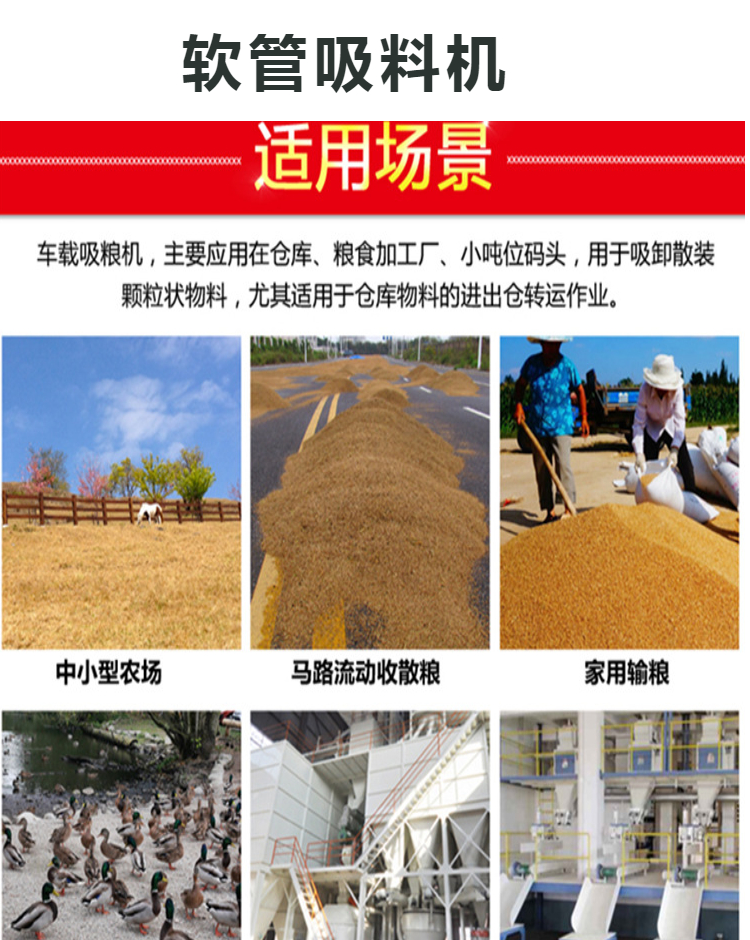 小型车载吸粮机亦可以用在养殖场,饲料厂、食品厂、塑料厂等输送颗料的场合。小型车载吸粮机可输送小麦、大豆、玉米、稻谷、高梁、塑料、树脂、大米等颗粒。可水平、倾斜方式输送,比任何运送方式、运送成本都低。小型车载吸粮机改变传统运送方式,解放劳动力,方便适用,必将掀起新的输送革命。