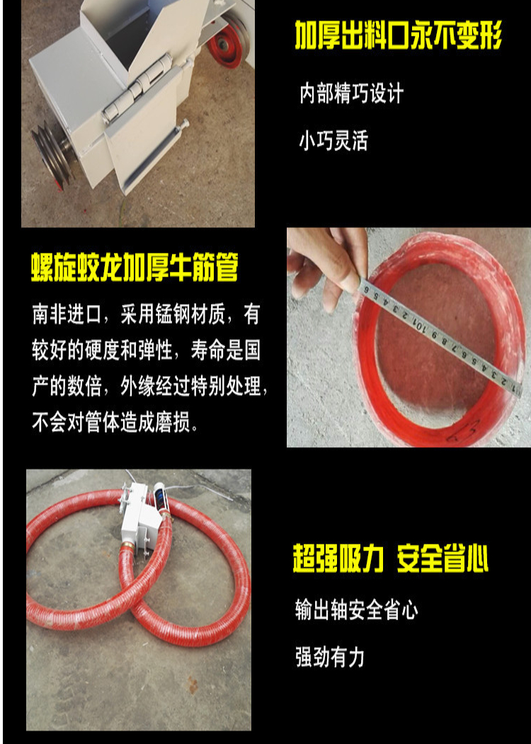 5、一机多用,可以吸送粮食,又可吸送颗粒状化肥、饲料、化工产品及其他无腐蚀性颗粒状物料。