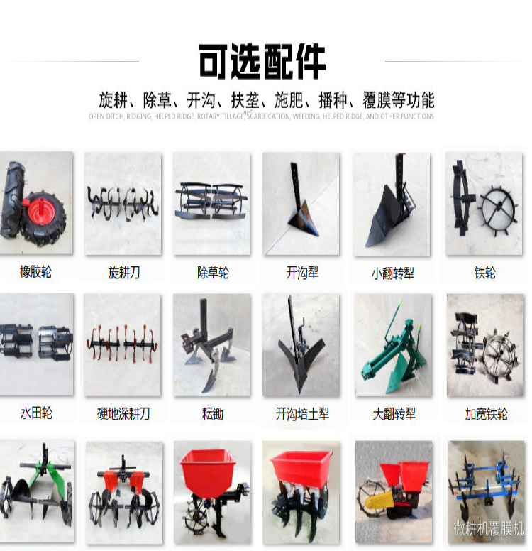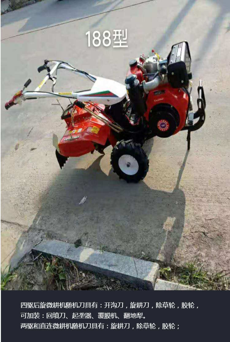 3.功能多,本机可在只更换作业刀具的情况下完成、扶垄、开沟、培土等多种农田作业,是农民朋友发家致富的得力助手。