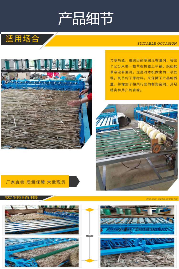 草帘编织机能够快速的来编制草帘,通过机器设备来编制,不仅能够节省人力,而且所编制的产品种类多样,规格统一,非常适合批量制作,它的出现,大大提高了编织速度,草帘制品也能及时供应。广泛适应于大棚、砖厂、予制厂、草皮、路面、车皮包装等行业。是中小企业个人的致富机械。
