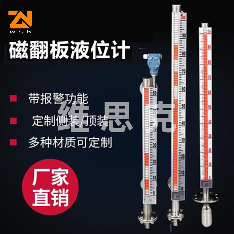 磁翻板液位计是本公司引进、收外同类产品,并加以收、消化、提高,按原化学工业 部颁布的磁性液位计标准HG/T21584-95研制生产的产品。可用于各种塔、罐槽、球形容器和锅炉等设备的介质液位检测。该系列磁性液位计可以做到 密封,防泄漏和适应高压高温、腐蚀性条件下的液位测量,具有可靠的安全性,它弥补了玻璃板(管)液位计指示不清晰,易破碎的不足,不受一、低温度剧变的影响,不需多组液位计的组合。全过程测量无盲区,显示醒目、读数直观,且测量范围大。特别是现场指示部分,由于不与液体介质直接接触,所以对高温、高压 粘度、有有害、强腐蚀性介质, 显其优越性。因此,它比传统的玻璃管,板式液位计具有 的可靠性、安全性、先进性、实用性。