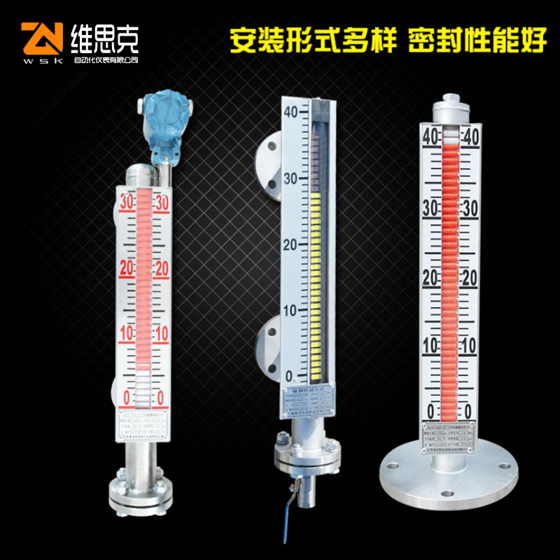 磁翻板液位计是本公司引进、收外同类产品,并加以收、消化、提高,按原化学工业 部颁布的磁性液位计标准HG/T21584-95研制生产的产品。可用于各种塔、罐槽、球形容器和锅炉等设备的介质液位检测。该系列磁性液位计可以做到 密封,防泄漏和适应高压高温、腐蚀性条件下的液位测量,具有可靠的安全性,它弥补了玻璃板(管)液位计指示不清晰,易破碎的不足,不受一、低温度剧变的影响,不需多组液位计的组合。全过程测量无盲区,显示醒目、读数直观,且测量范围大。特别是现场指示部分,由于不与液体介质直接接触,所以对高温、高压 粘度、有有害、强腐蚀性介质, 显其优越性。因此,它比传
