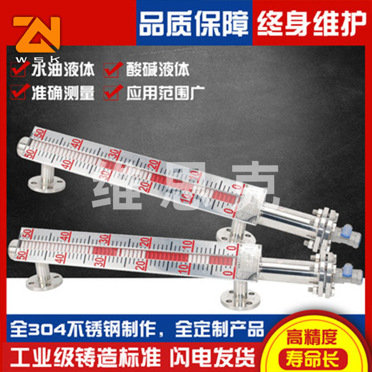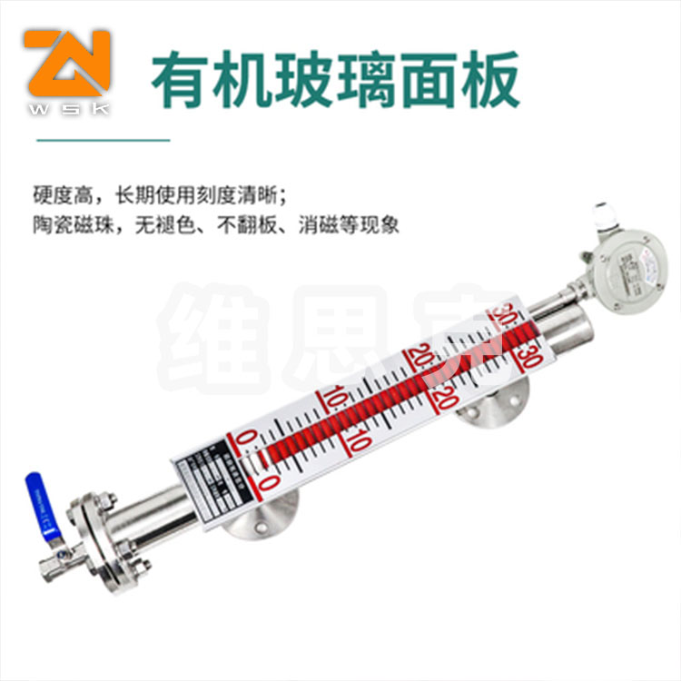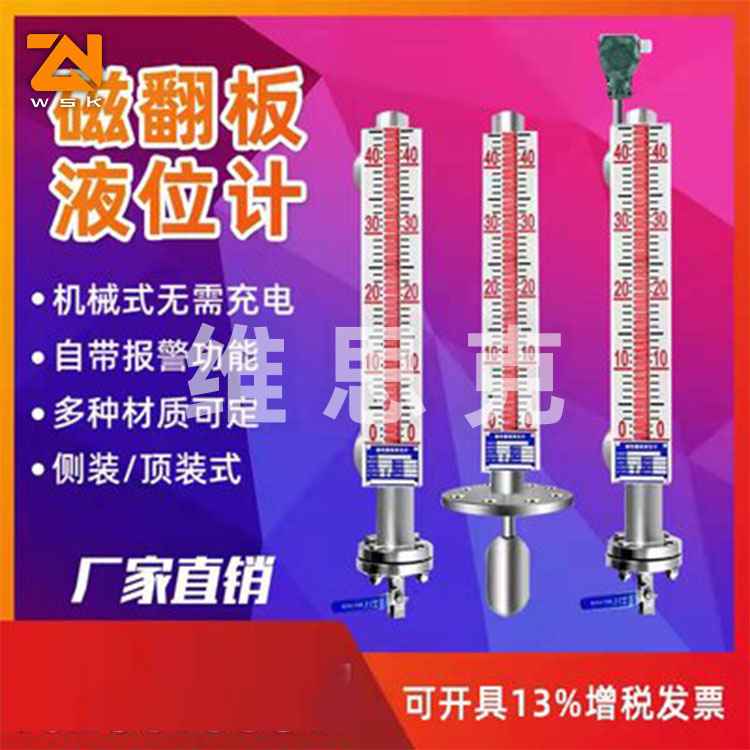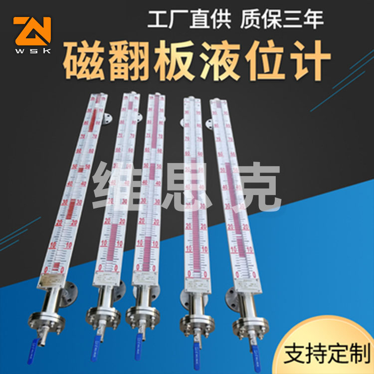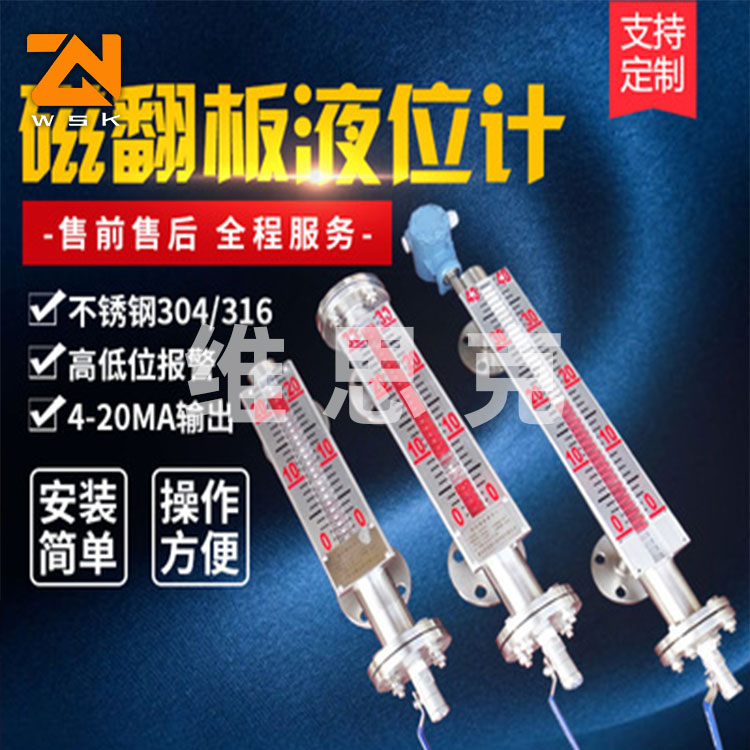 磁翻板液位计是本公司引进、收外同类产品,并加以收、消化、提高,按原化学工业 部颁布的磁性液位计标准HG/T21584-95研制生产的产品。可用于各种塔、罐槽、球形容器和锅炉等设备的介质液位检测。该系列磁性液位计可以做到 密封,防泄漏和适应高压高温、腐蚀性条件下的液位测量,具有可靠的安全性,它弥补了玻璃板(管)液位计指示不清晰,易破碎的不足,不受一、低温度剧变的影响,不需多组液位计的组合。全过程测量无盲区,显示醒目、读数直观,且测量范围大。特别是现场指示部分,由于不与液体介质直接接触,所以对高温、高压 粘度、有有害、强腐蚀性介质, 显其优越性。因此,它比传统的玻璃管,板式液位计具有 的可靠性、安全性、先进性、实用性。