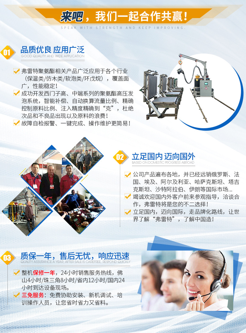 我们是万科集成墙、新明珠集团和贵州航天、康特博座椅等企业的合作厂家,聚氨酯发泡机相关产品已广泛应用于各个行业的客户厂家,细分为环戊烷类/保温填充类/软泡自结皮高慢回弹类/仿木类等适用众多行业的设备,应用于:地暖板、集成墙、保温水箱、电气通信柜、太阳能、汽车座椅、汽车内外饰件、工艺品、冰箱冷柜、消毒柜、热水器、蒸饭柜、药品阴凉柜、展示柜、北方砖雕、家具装饰仿木、记忆枕、屋顶隔热、保温板材、管道保温、体育用品、医疗器械等生产厂家,覆盖面宽广,性能稳定!并且已经远销到俄罗斯、德国、法国、孟加拉、阿尔及利亚、沙特阿拉伯等。。。公司秉承“品质上乘,用户至上”的经营理念,潜心打造国内外聚氨酯行业实力品牌!