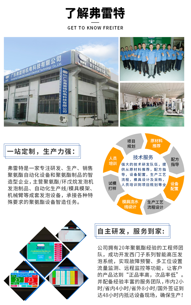 欢迎了解弗雷特聚氨酯发泡机!广东弗雷特机电科技有限公司位于广东中山南头升辉北工业区,是一家集研发、生产、销售、售后于一体的聚氨酯发泡自动化生产企业,主要生产适合现代环保生产工艺的聚氨酯发泡机、环戊烷发泡机、聚氨酯原料、各类智能发泡生产线、发泡模具模架、机器人等集成一体化的聚氨酯发泡成套定制体系,并且免费提供聚氨酯自动化方案和技术服务。