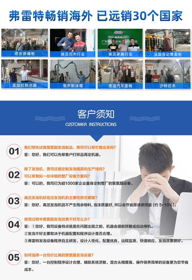 公司聚氨酯相关产品已广泛应用于各行业领域(保温类/仿木类/软泡类/环戊烷),受到高度好评和信赖!产品已经远销到俄罗斯、法国、马来西亚、泰国、埃及、阿尔及利亚、巴基斯坦等国外市场。。。我们始终坚持产品多元化、设备化、品牌国际化、服务系统化的战略发展路线,让世界了解“弗雷特”,了解中国造!