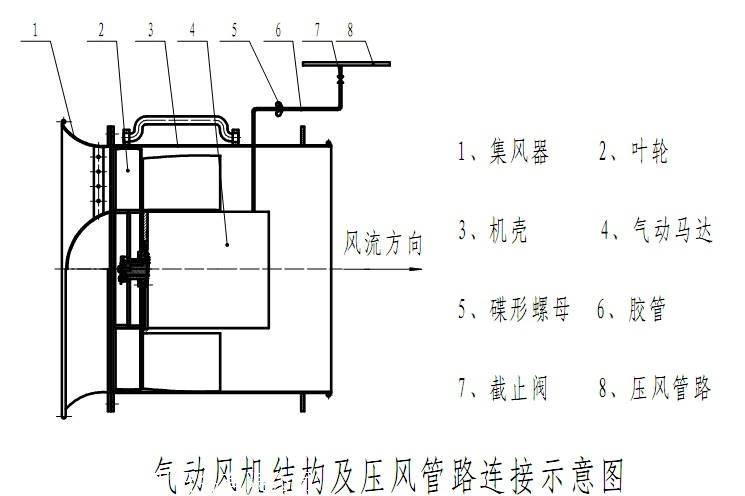抽出式气动风机由井下压气管道中引出的压气通过胶管与气动风机外壳上的气动马达进气口联接后,开启阀门,压气驱动马达转动带动风叶轮旋转,叶轮对空气做功,使空气具有能量后以一定的速度排出风机,由抽出式气动风机专用正负压风筒引导到需要的地方。