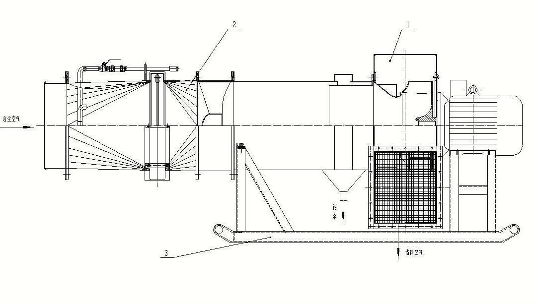 风机将粉尘气体与加湿喷雾水充分混合,各种粒径的粉尘颗粒通过吸湿并高速碰撞后形成大颗粒的泥粒,以设定的切向速度进入旋流密度分离装置;在旋流密度分离装置中,高速旋转的气、水、泥三相混合气体在离心力场中根据粒径和密度分层,泥粒、大颗粒的水珠加速靠近并吸附到筒壁上排出,带有小水珠的干净空气在再经水气分离后排出,从而达到空气净化效果。