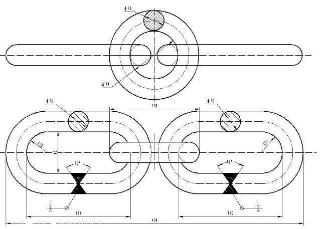 30mm连接圆环链采用45#碳素结构钢制作,钢材应为全镇静钢,其化学成份应符合GB/T699规定,圆环采用模锻,必须进行热顶锻试验,试验方法和结果符合GB/T233的规定;长环应选用热压棒材。