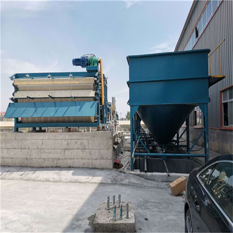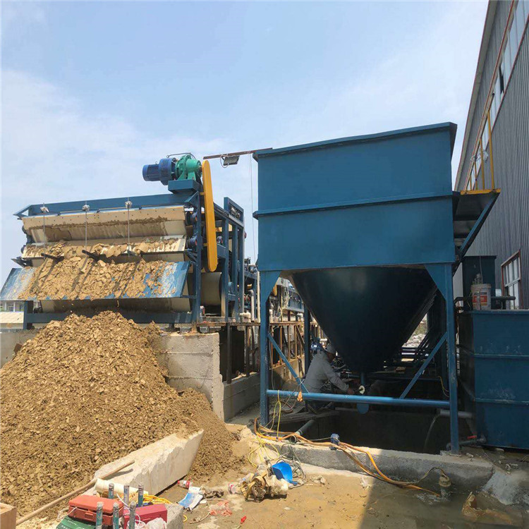 洗沙污水处理设备中所使用的带式压滤机是连续运转的固液分离设备,污泥经絮凝,低真空(重力)脱水,低压脱水和高压脱水后,泥饼随滤布运行到卸料辊时落下。