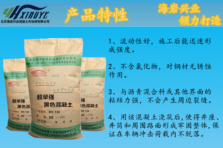 超早强黑灰色混凝土主要应用于现浇和预制混凝土、预应力钢筋混凝土及外掺粉煤灰混凝土,对普通硅酸盐水泥、矿渣硅酸盐水泥和火山灰硅酸盐水泥等均有较好的适应性。本产品对混凝土冬季施工效果显著。除此之外,超早强黑灰色混凝土还适用于自然养护的混凝土工程及制品,道路抢修工程。本产品减水增效显著,早期增强尤佳,可大大加快模板和场地周转,缩短工期。