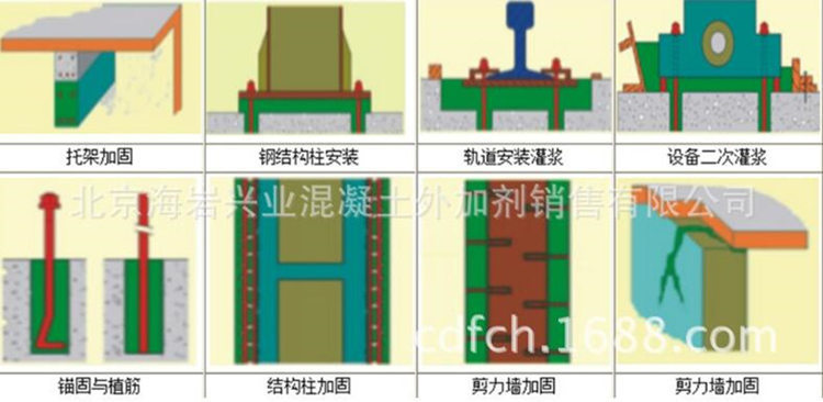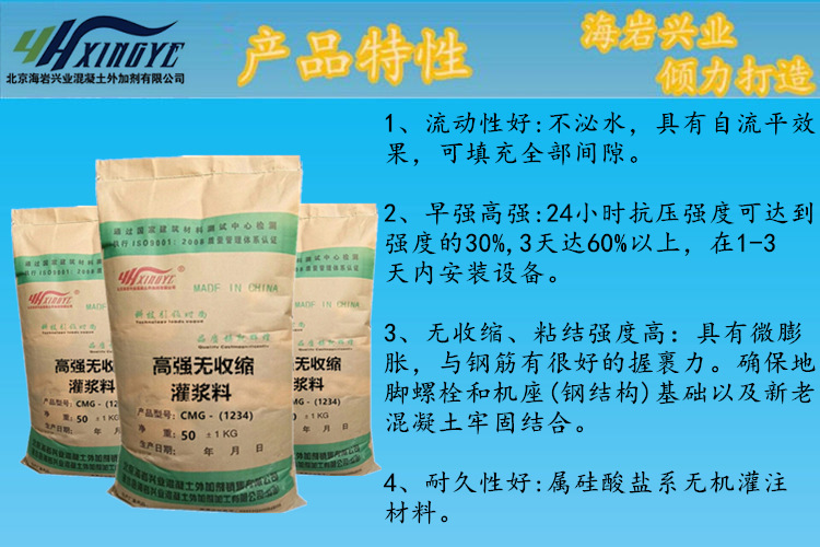 以水泥为基材,适量加入天然高强度骨料、混凝土外加剂等组成的干混材料,加水拌合后具有高流动度、早强、高强、微膨胀等特性。广泛用于设备基础的二次灌浆,钢结构柱基础灌浆,轨道基础等小缝隙粘结灌浆,地铁、隧道、地下工程逆做法施工缝嵌固,地脚螺栓锚固,混凝土梁、柱、板、墙的加固修补灌浆,普通混凝土难以浇注的不规则死角、边角及混凝土空洞补罐修复;地基加固灌浆等。产品分为I、II、III、IV、V型,