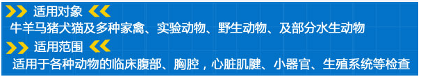 适用于各种动物的临床腹部,胸腔,心脏,肌腱、小器官,眼球,生殖系统,家禽、实验动物、小动物、及部分水生动物。