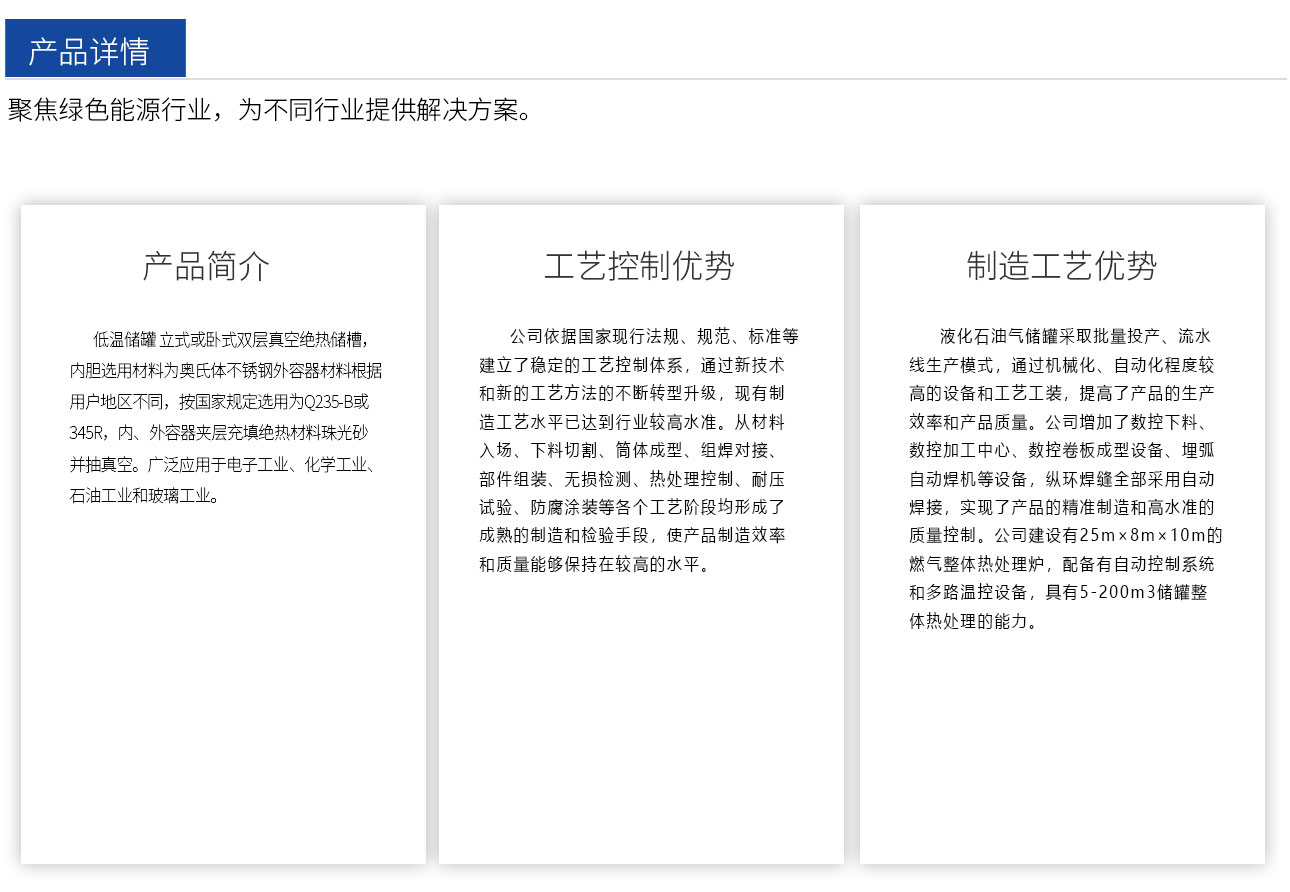 低温压力容器的质量与产品设计、材料性能、制造技术、焊接技术、热处理工艺、无损检测技术等多方面的因素有关。国内外对该容器均有严格规定。在我国建造和使用的低温容器设计、制造、检验和验收按GB150.1~150.4-2011《压力容器》执行。近年来公司根据市场需求生产的系列储罐容积有5、12、15、20、25、30、40、50、60、80、100 m3 等规格。30方LCO2储罐就是本公司的常规产品之一
