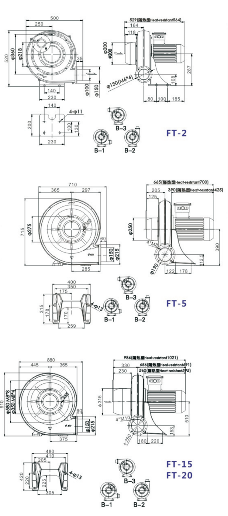 3.所有防爆透浦风机的安装尺寸、及风口尺寸与原透浦风机相同,仅配套防爆电机尺寸有异,订购时请确认安装工况是否有影响;