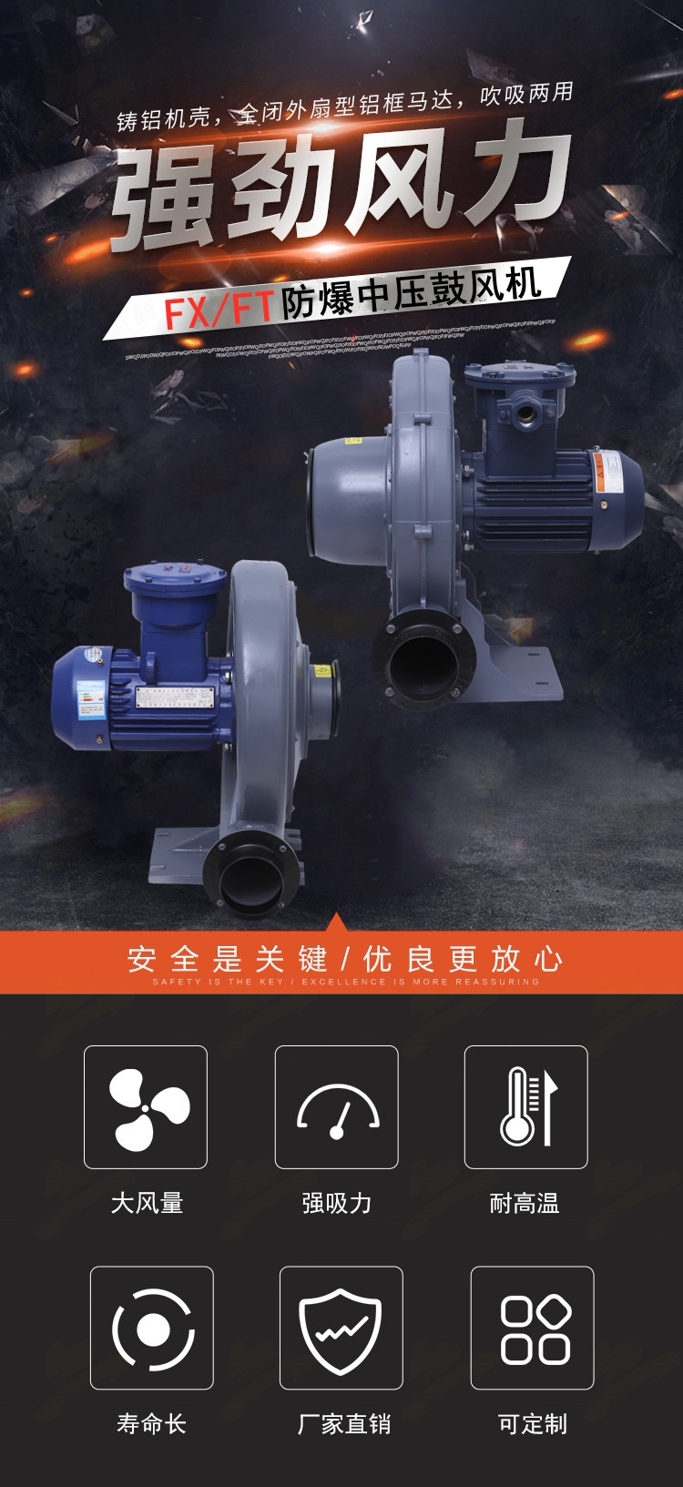 2.防爆透浦风机兼容透浦风机风压、风量特性,应用除矿用环境外的任一工况(防腐的耐酸碱性可内外喷防腐漆工艺)。