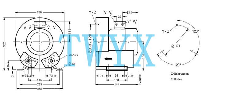 | 外型尺寸:269*286*302 真空漩涡式气泵常用参数、技术要求: 压力:旋涡气泵的压力指升压(相对于大气的压力),即气体在风机内压力的升高值或者该风机进出口处气体压力之差。它有静压、动压、全压之分。性能参数指全压(等于风机出口与进口总压之差),其单位常用Pa、KPa、mH2O、mmH2O等。 流量:单位时间内流过风机的气体容积,又称风量。常用Q来表示,常用单位是;m3/s、m3/min、m3/h(秒、分、小时)。(有时候也用到“质量流量”即单位时间内流过风机的气体质量,这个时候需要考虑风机进口的气体密度,与气体成份,当地大气压,气体温度,进口压力有密切影响,需经换算才能得到习惯的“气体流量”。 转速:风机转子旋转速度。常以n来表示、其单位用r/min(r表示转速,min表示分钟)。 功率:驱动风机所需要的功率。常以N来表示、其单位用Kw。