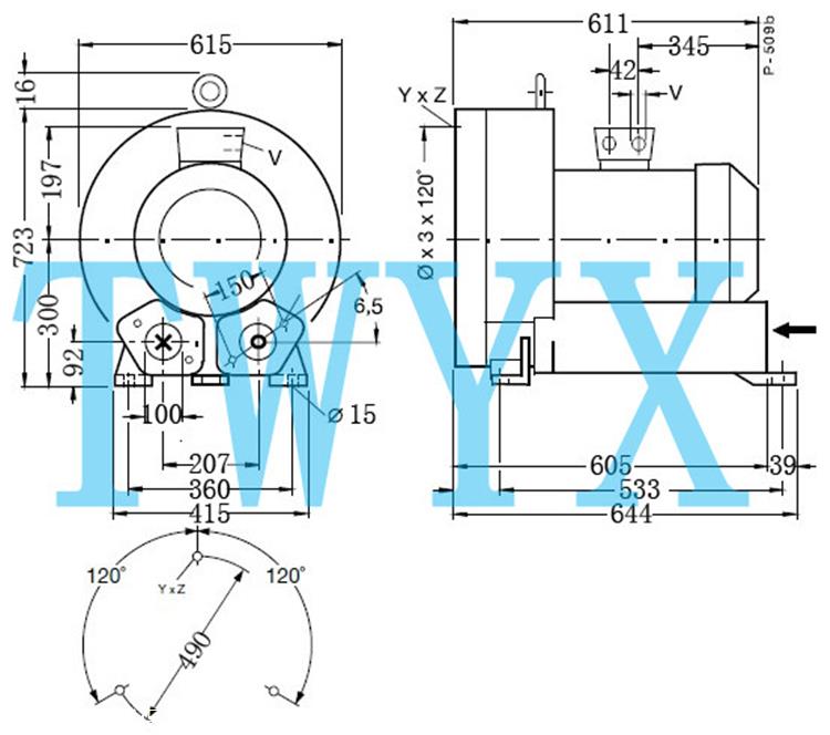 | 外型尺寸:644*550*569 出入口径:4寸 气泵功能: 1.吸风功能:工事现场、网版印刷机吸附、焊接废气吸取、瓦斯分解、工业吸尘、织布机吸丝、粉粒体输送、印刷吸附、真空脱水、制书本机、残布处理、牛乳纸盒充填机、豆腐机械、加工物的保持、照相制版、烫布机。 2.吹风功能:洗瓶机吹干、纸布条吹送、瓦斯重油喷燃、干燥用空气刀、裁断机气垫、畜粪发酵爆气、电解液搅拌、洗净后吹干、养殖池氧气补给、冲床机便利冲压后取成型品、粉粒体输送、焚化炉排废、烟气吹吸、洗车吹干、票据输送、印刷机强制干燥。