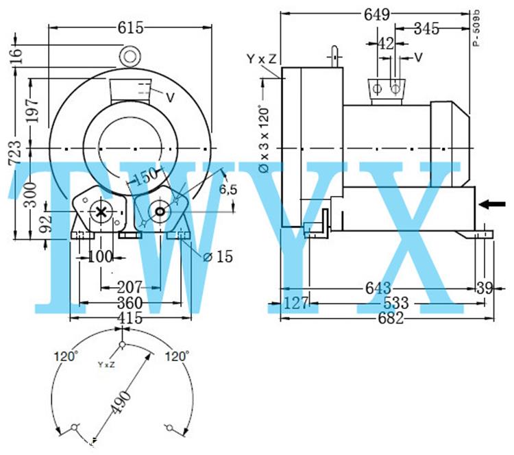| 外型尺寸:682*550*569 出入口径:4寸 漩涡气泵参数选型: 漩涡高压风机选型主要参数依据有:功率,风量风压(需要一定要求来计算),电压等。 由于漩涡气泵的使用非常的广泛,它的选型方式和高压风机是一样的。一般来说,需要按以下两个步骤进行: 1、需要确定现场是使用高压风机的什么功能,是吸还是吹,找准高压风机对应的压力-流量曲线;如果看错曲线,有时候会造成选出来的产品不能使用; 2、根据计算出来的压力和流量,在曲线图上找到同时满足压力和流量对应的工作点以上的工作曲线;然后根据工作曲线选择高压风机型号;
