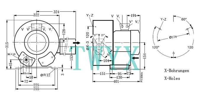 | 外型尺寸:401*322*315 进出口径:1.5寸(40) 真空漩涡式气泵常用参数、技术要求: 压力:旋涡气泵的压力指升压(相对于大气的压力),即气体在风机内压力的升高值或者该风机进出口处气体压力之差。它有静压、动压、全压之分。性能参数指全压(等于风机出口与进口总压之差),其单位常用Pa、KPa、mH2O、mmH2O等。 流量:单位时间内流过风机的气体容积,又称风量。常用Q来表示,常用单位是;m3/s、m3/min、m3/h(秒、分、小时)。(有时候也用到“质量流量”即单位时间内流过风机的气体质量,这个时候需要考虑风机进口的气体密度,与气体成份,当地大气压,气体温度,进口压力有密切影响,需经换算才能得到习惯的“气体流量”。 转速:风机转子旋转速度。常以n来表示、其单位用r/min(r表示转速,min表示分钟)。 功率:驱动风机所需要的功率。常以N来表示、其单位用Kw。