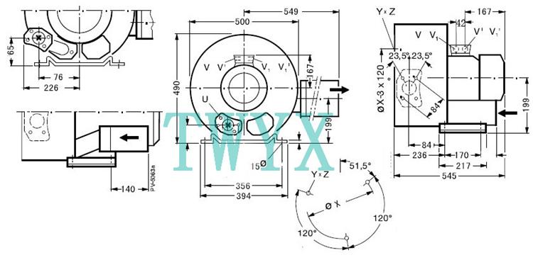 | 外型尺寸:589*549*490 进出口径:2.5寸(65) 真空漩涡式气泵常用参数、技术要求: 压力:旋涡气泵的压力指升压(相对于大气的压力),即气体在风机内压力的升高值或者该风机进出口处气体压力之差。它有静压、动压、全压之分。性能参数指全压(等于风机出口与进口总压之差),其单位常用Pa、KPa、mH2O、mmH2O等。 流量:单位时间内流过风机的气体容积,又称风量。常用Q来表示,常用单位是;m3/s、m3/min、m3/h(秒、分、小时)。(有时候也用到“质量流量”即单位时间内流过风机的气体质量,这个时候需要考虑风机进口的气体密度,与气体成份,当地大气压,气体温度,进口压力有密切影响,需经换算才能得到习惯的“气体流量”。 转速:风机转子旋转速度。常以n来表示、其单位用r/min(r表示转速,min表示分钟)。 功率:驱动风机所需要的功率。常以N来表示、其单位用Kw。
