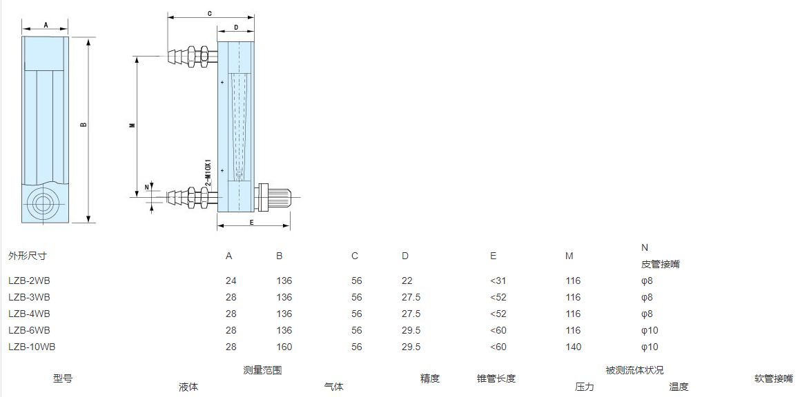 这里,Q是实际使用流量;P、T、Po、To都为已知,用〔6〕式d算出的Qn即为将要选购的转子流量计的刻度流量值。注意,Q应是常用流量。为保证流量计使用时有足够精度和余量,选购玻璃转子流量计的上限应为Qn的1.5倍。