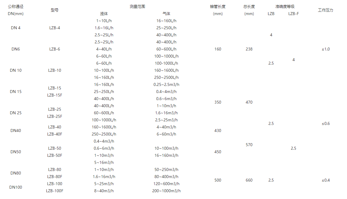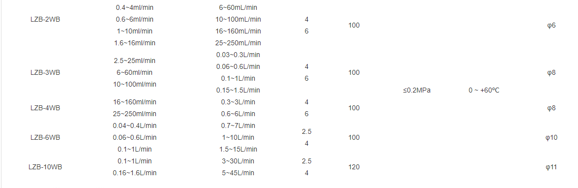 玻璃转子流量计根据它的用途和适应范围可分为:普通型、带筋维管型,微小流量及小外形型、耐腐型、实验室型、保温型、报警型和耐高压型八个系列。按照国家制订的仪表系列型谱,不论哪个系列,最多包括从1毫米到100毫米共12个口径数,可测量的流量范围是:液体(水)0.1毫升/分~40立方米/时,气体(空气)1毫升/分~1000立方米/时。用于环保仪器配套的玻璃转子流量计一般口径不超过10毫米,测量的流量属小流量范围。