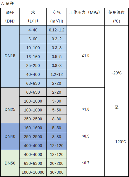 3.流量范围是由通径决定,和型号及连接方式等无关。