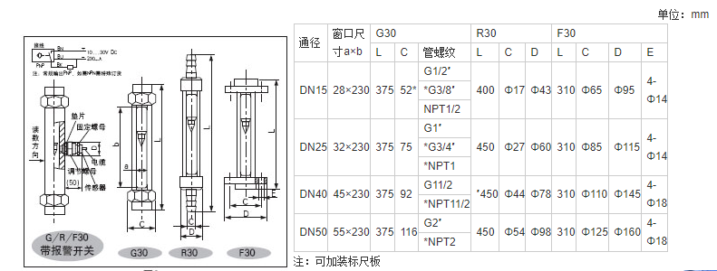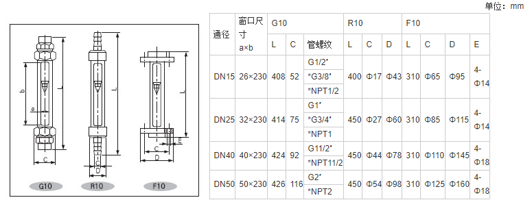 G/R/F10、20、30型玻璃转子流量计的连接有管螺纹(G10、20、30型)、软管(R10、20、30型);法兰(F10、20、30型)三种方式。其耐压和耐温均高于原有相同通径的LZB/LZJ系列玻璃转子流量 计产品;分普通型(测量一般无腐蚀流体)和耐腐型(测 量的腐蚀性流体)两种。产品体积小、结构轻巧,外形 美观,维修方便、安全可靠,安装简单。F10、20、30型 法兰可转动,与现场管道法兰孔吻合。